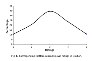 The distribution of scores on Douban, a Chinese movie reviews site, is very different. The users there seem to routinely report even their average experiences1: